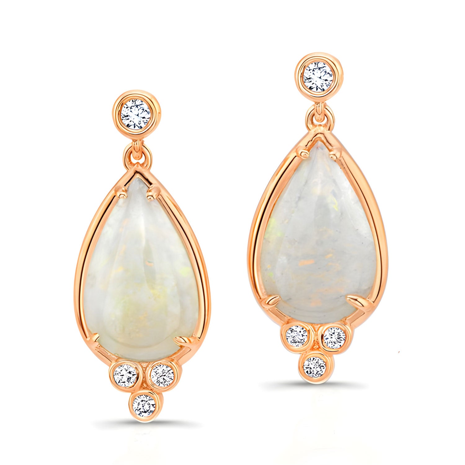 The amazing pair of earrings features eight round brilliant cut diamonds and two pear shaped opals set in 14kt rose gold. The total diamond weight of the pair is approximately 0.15ctw.