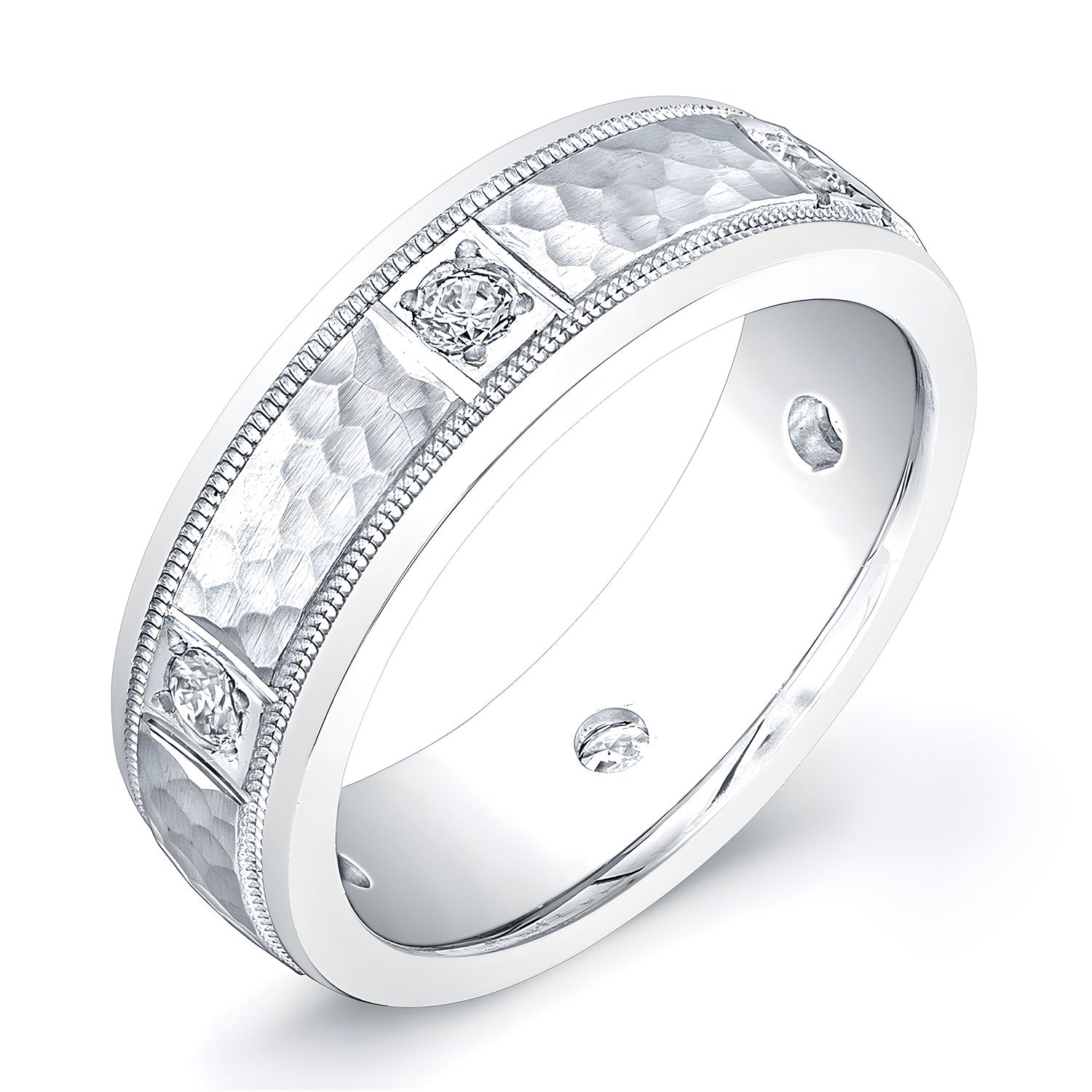 6mm multiple diamond hammered men's wedding band with milgrain and polished edges.