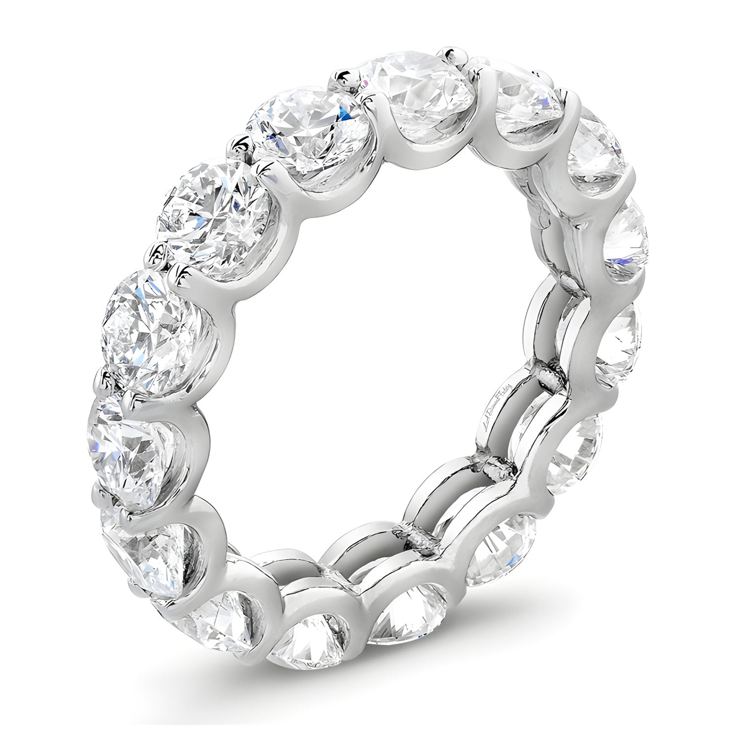 This is our signature diamond eternity wedding band. This u-prong setting features 15 round brilliant cut diamonds weighing 6.35ctw. Does this ring not fit you? Contact us about custom making one to fit you and your budget!
