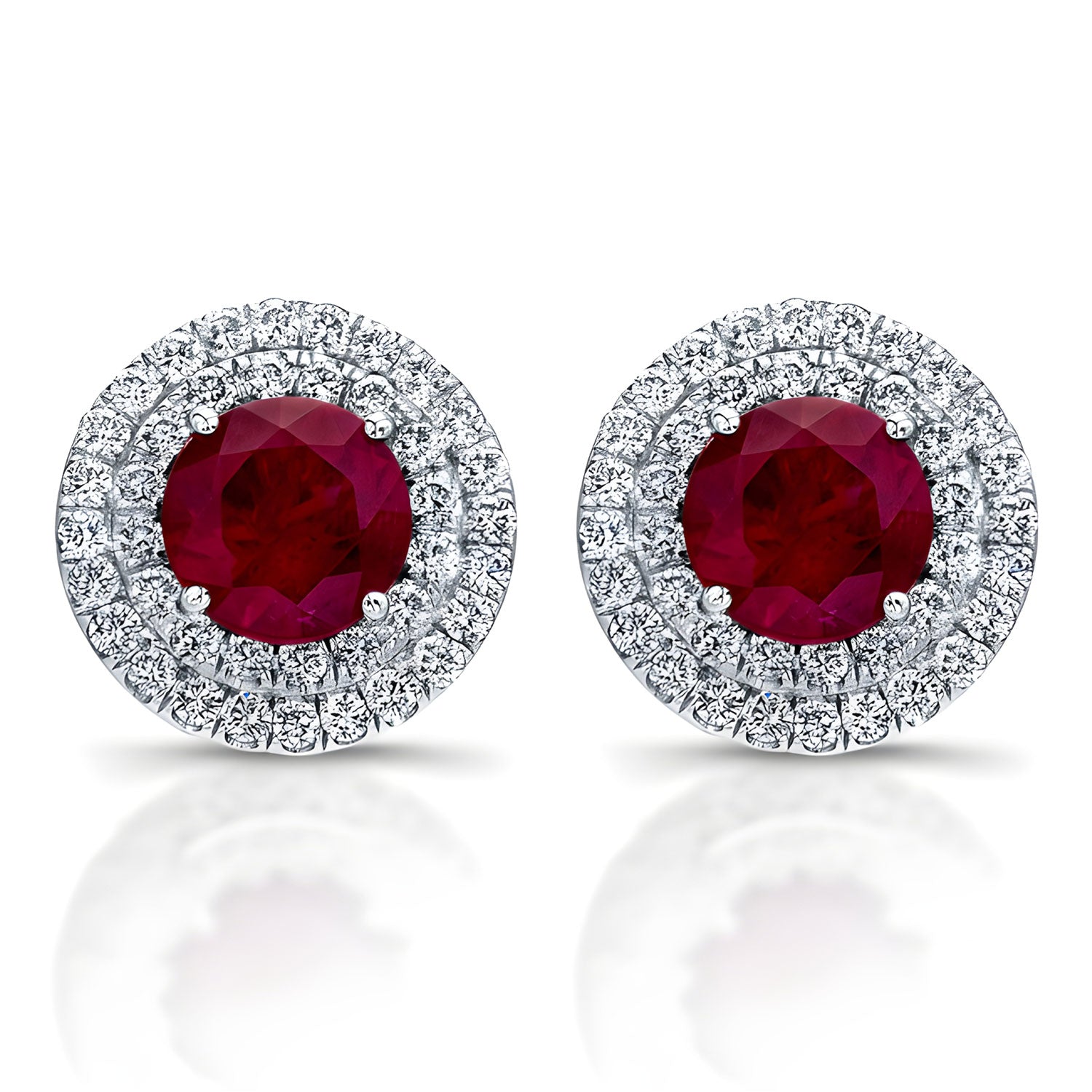 These handmade halo diamond earrings feature round ruby centers with a total ruby and diamond weight of 1ct. Each pair is made in Los Angeles.