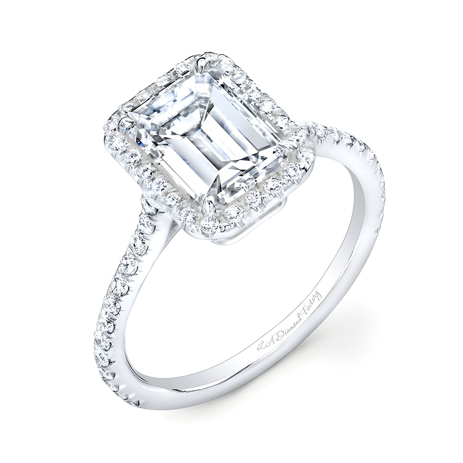 This halo ring features 14kt white gold and an emerald cut center set in one of our signature halo settings. We can fit this signature halo design within your budget! Give us a call today to discuss designing a ring similar to this within your budget!