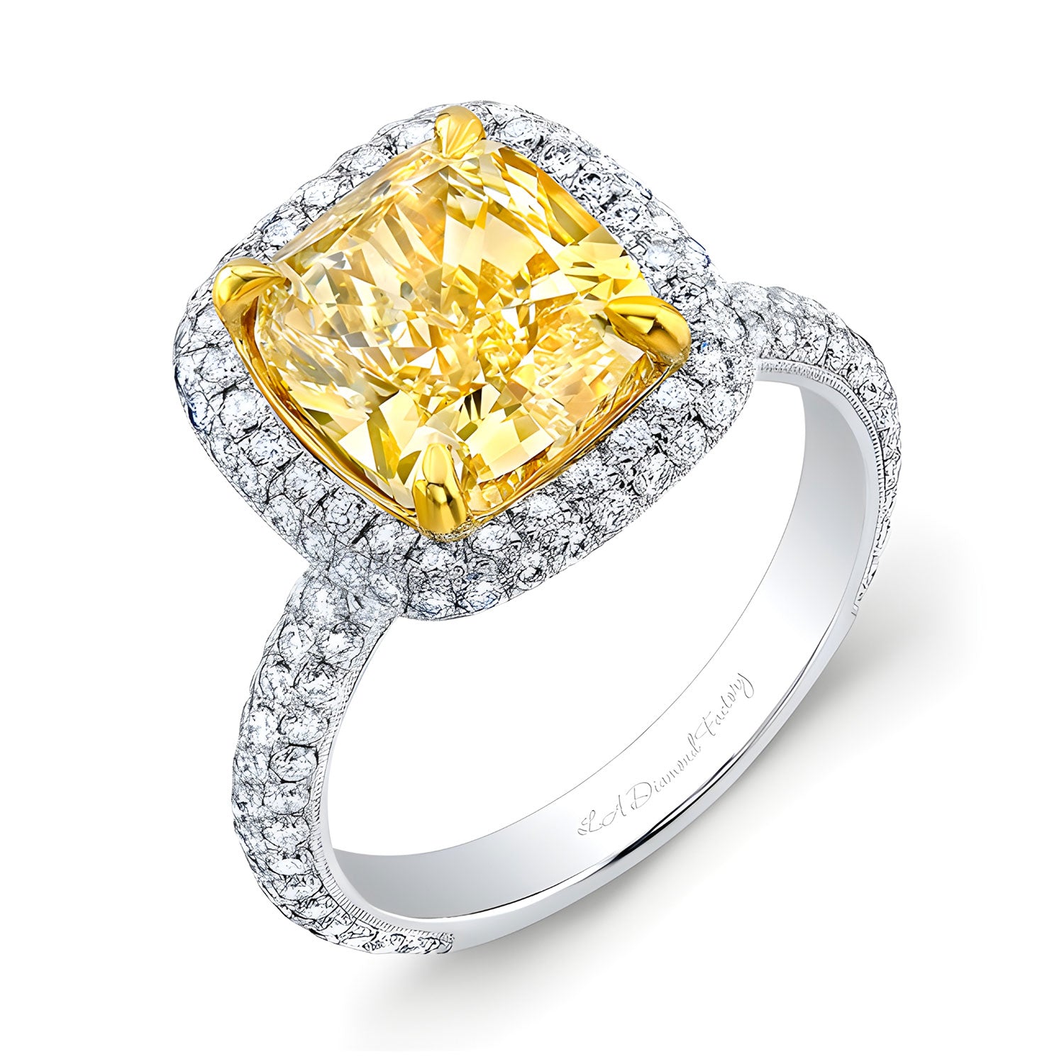 This micro-pave halo engagement ring features a fancy colored yellow diamond in the center. The center diamond is surrounded by 0.58ctw of micro-pave set diamonds. This custom made setting takes approximately two weeks to complete. It can be made to accommodate any sized center diamond. Price does not include center stone