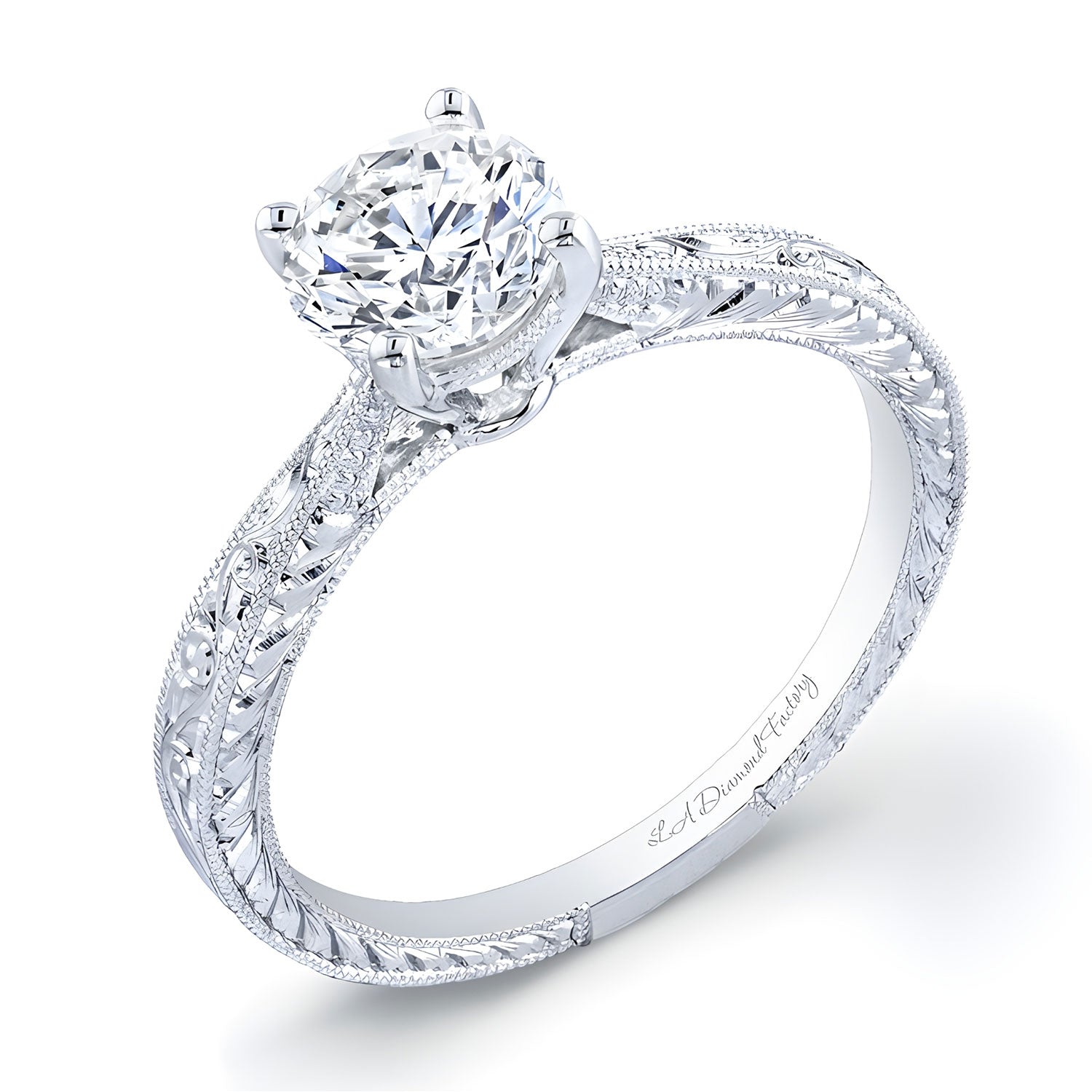 This four prong, hand engraved solitaire engagement ring features mil-grained edges and can accommodate several center diamond shapes. Each ring is hand made in Los Angeles. Contact us for information on finding a center diamond.