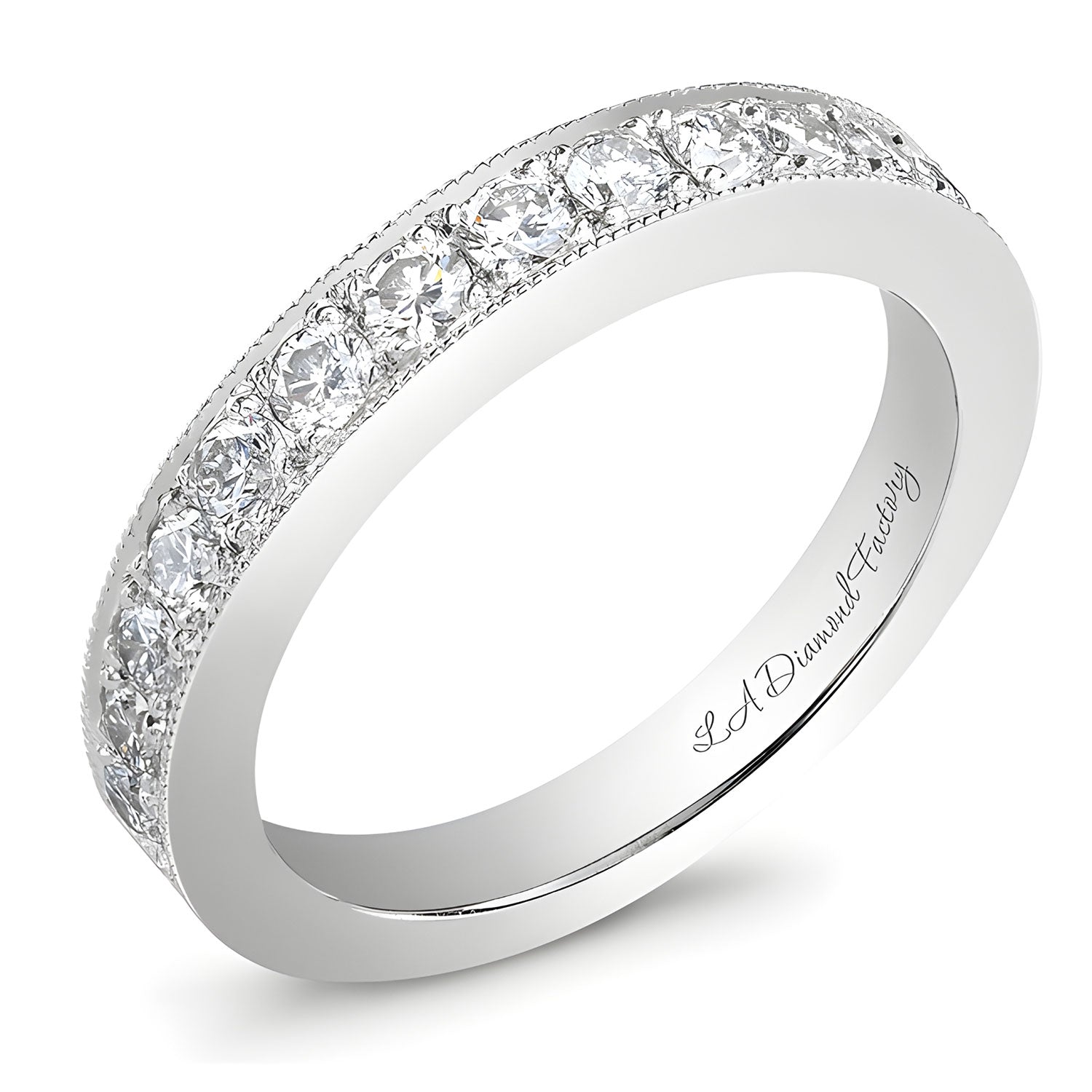 Pave diamond wedding band with milgrained edges. This beautiful wedding band features round brilliant cut diamonds going 60% of the way around the band for a total diamond weight of approximately 1/2ctw. The edge of the wedding band has a milgrained finish. Approximately 2.2mm in width.