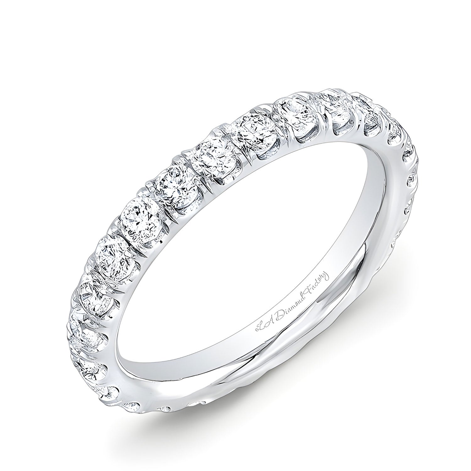 Scalloped pave diamond wedding band with diamonds either 1/2 or 3/4 of the way around. Each diamond is handset in Los Angeles. Approximately 2.3mm in width.