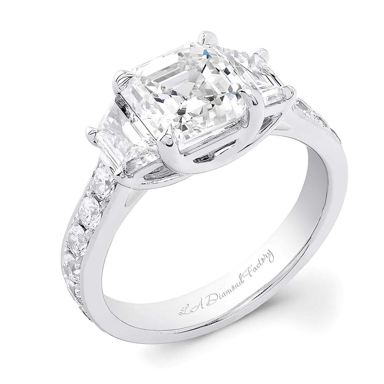 This three stone engagement ring features an asscher cut diamond flanked by two tapered baguettes. The shank of the ring has round brilliant diamonds pave set going 75% of the way around the ring. This style setting can be made to accommodate any size or shape center. Price does not include center stone
