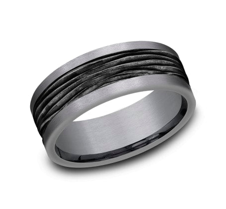 Extremely unique and distinguishing, this 8mm gray Tantalum design band features a horizontal bark pattern carved into the rings black titanium center.